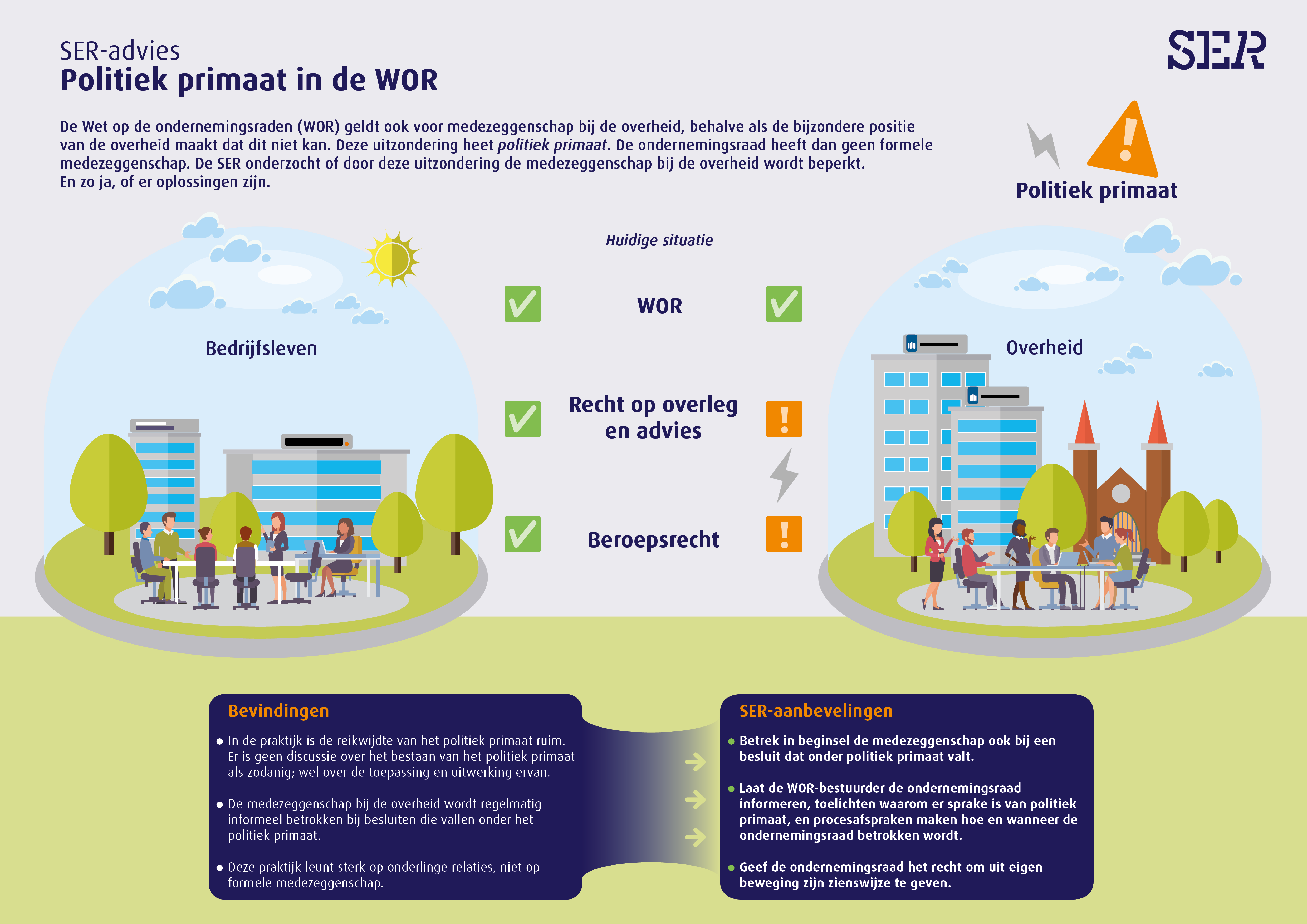 Daarbij beveelt de SER aan dat de bestuurder de or tijdig informeert bij voorgenomen besluiten die onder het politiek primaat vallen. De bestuurder licht dan toe waarom er sprake is van het politiek primaat en de or op dat moment (nog) geen formele medezeggenschap heeft. Gelijktijdig maakt de bestuurder met de ondernemingsraad procesafspraken. In die afspraken leggen zij vast wanneer en op welke manier de or in het besluitvormingstraject betrokken wordt, als dat mogelijk is. Daarnaast krijgt de or het recht om uit eigen beweging zijn zienswijze op een voorgenomen besluit aan de WOR-bestuurder mee te geven.