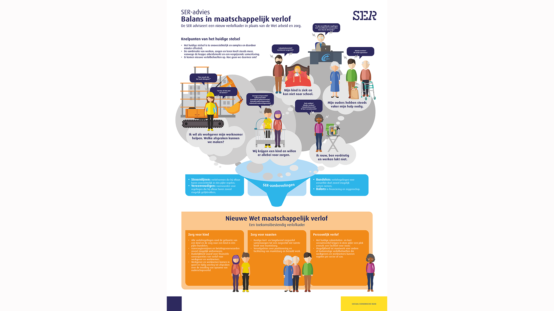 De SER adviseert het nieuwe kabinet om de huidige verlofregelingen (vastgelegd in de huidige Wet arbeid en zorg) te vereenvoudigen en te bundelen in een nieuwe Wet maatschappelijk verlof. Die bestaat uit drie pijlers: zorg voor kinderen, zorg voor naasten en persoonlijk verlof. Daarbij is uitgegaan van de bestaande verlofrechten.