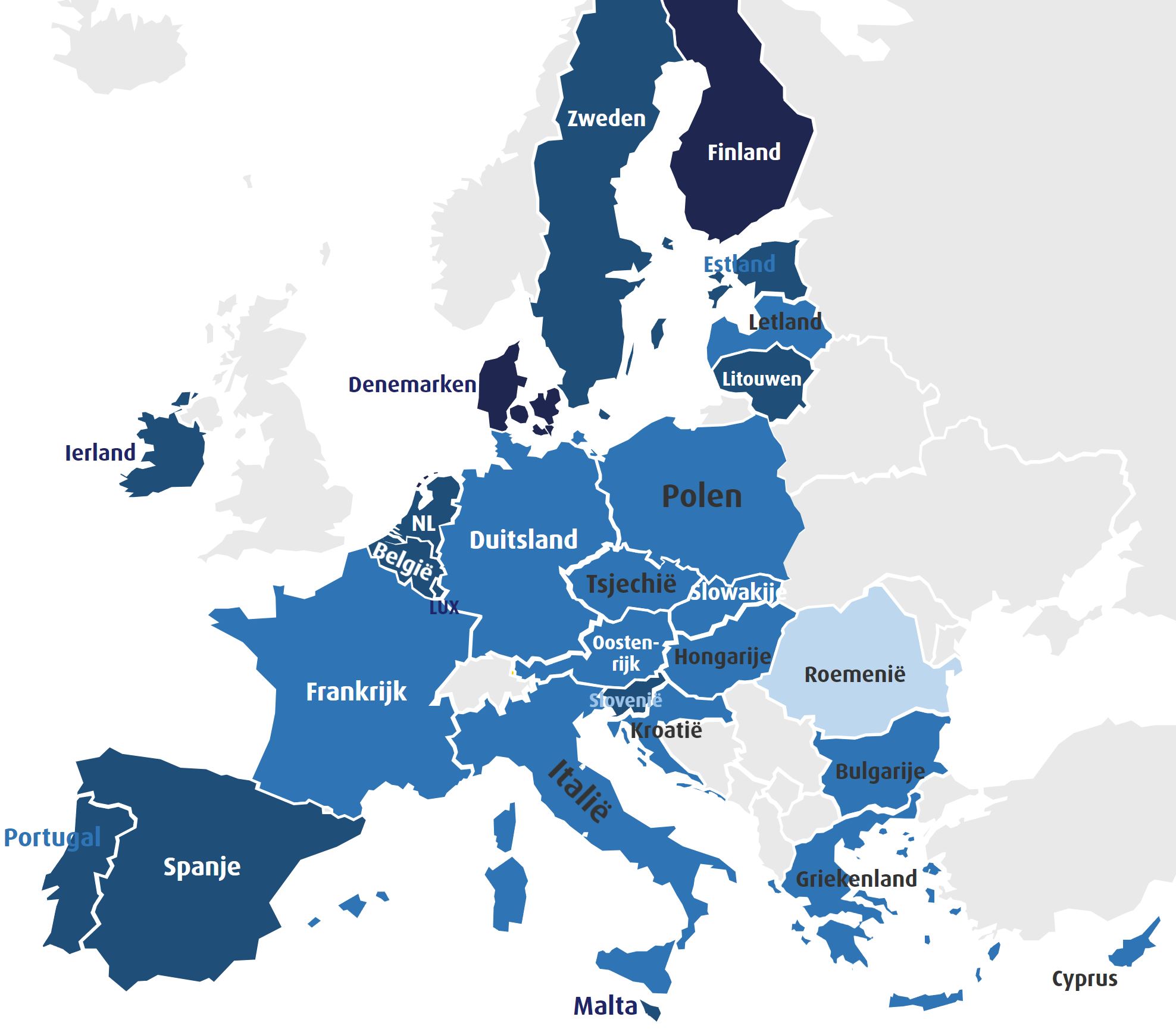 De kaart laat zien hoe de lidstaten scoren op het gebied van digitalisering op basis van de DESI-Index (Digital Economy and Society Index). Deze index van de Europese Commissie bepaalt hoe ver de digitale transitie in een land gevorderd is. De index meet dit op basis van vier indicatoren: