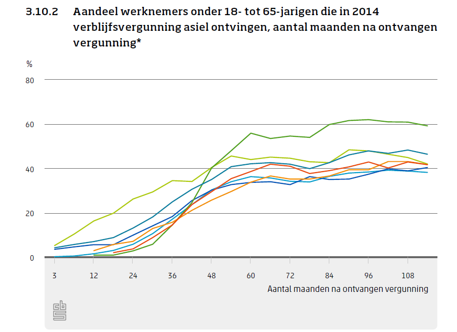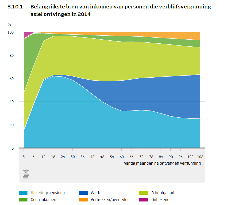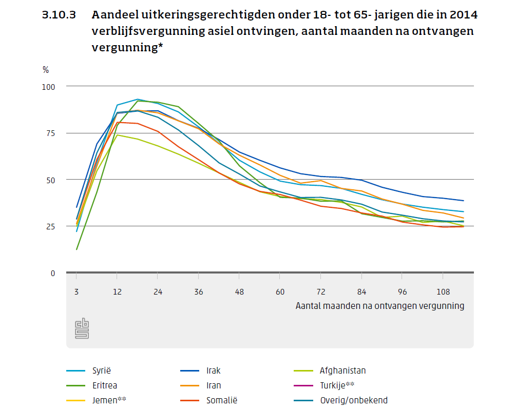 Anderhalf jaar na het verkrijgen van de verblijfsvergunning, ontvangt 89 procent van de 18-tot 65-jarigen die in 2014 een vergunning hebben gekregen, een uitkering. Drie jaar later – vier-en-een-half jaar na het verkrijgen van een vergunning – is dit percentage verder gedaald. Negen jaar na het ontvangen van een verblijfsvergunning krijgt 31 procent van