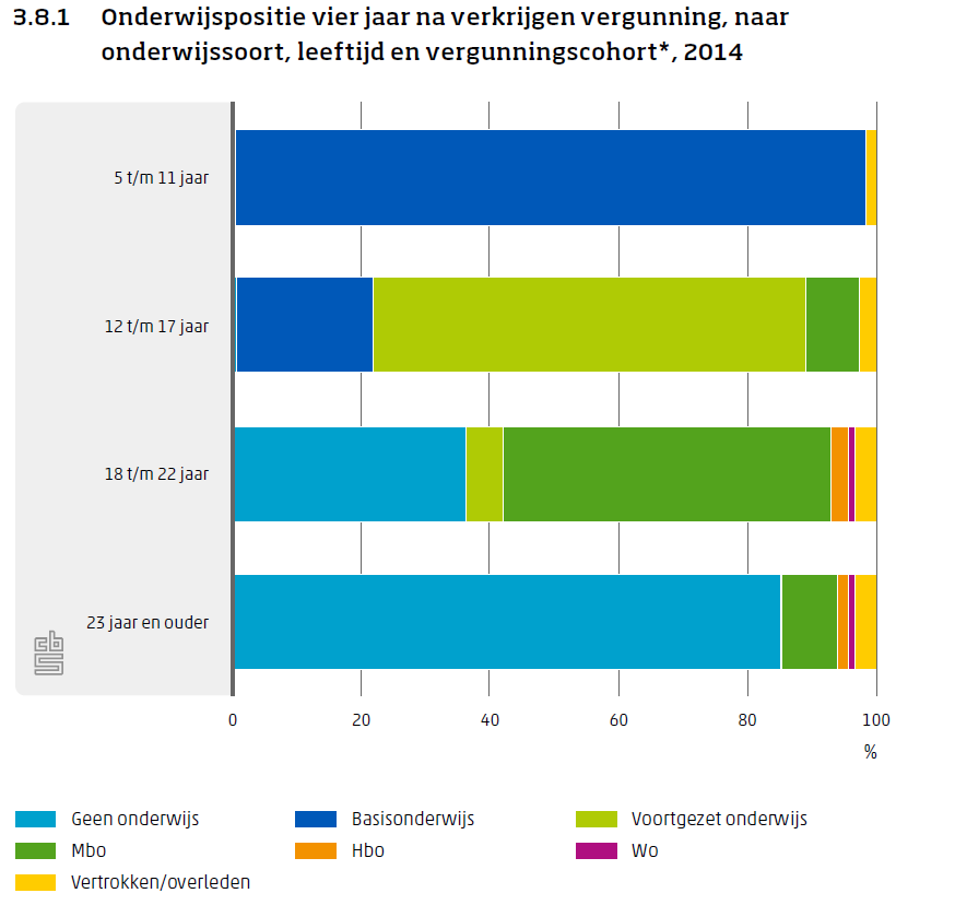 In de jaren die volgen stroomt een substantieel deel van de statushouders via mbo-1 of het vmbo door naar de hogere mbo-niveaus. Met het behalen van een diploma op mbo-2-4-niveau is een startkwalificatie voor de arbeidsmarkt behaald. Vier jaar nadat zij hun vergunning kregen, volgt 38% van de Syriërs die toen 12 tot 18 jaar oud waren onderwijs op mbo-2-4-niveau. Onder de overige statushouders is dit met 30% wat lager.